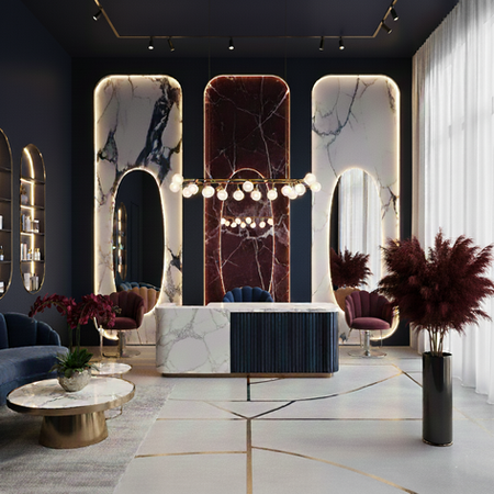 Projekt salonu powstał z myślą o stworzeniu przestrzeni, która łączy odważne kolory z elegancją i komfortem użytkowania, a jego głównym celem był efekt „wow”. Wyzwaniem było zastosowanie głębokiego granatu i bordowych akcentów w sposób, który nie przytłoczy wnętrza i pozwoli zachować jego premium charakter. Zastosowanie dekoracyjnej ściany jako centralnego punktu oraz stonowanych mebli i tekstur pozwoliło zrównoważyć intensywne kolory, tworząc harmonijną, luksusową przestrzeń, która robi wrażenie i sprzyja zarówno pracy, jak i relaksowi klientów.